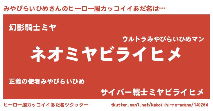 | ヘコむあだ名 | 『みやびらいひめ(苦笑)』『みやっちょ』 |