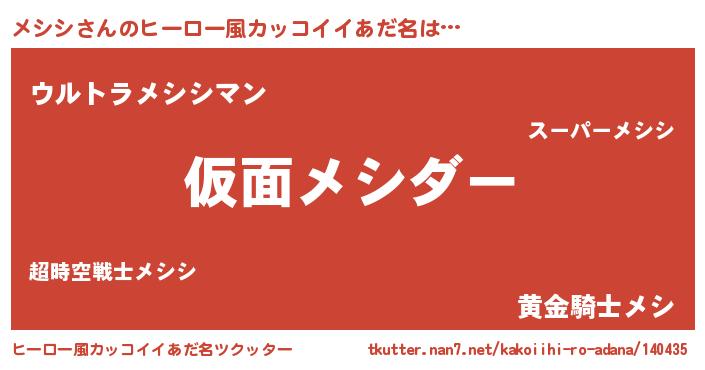 | 男性向けラノベタイトル風あだ名 | 『メシシスレイヤー』『魔弾の王とメシシ』 |