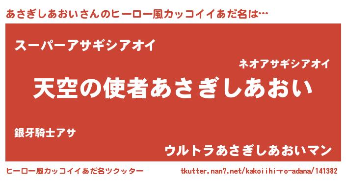 | 男性向けラノベタイトル風あだ名 | 『あさぎしあおい~年齢イコール彼女いない歴の魔法使い~』 |