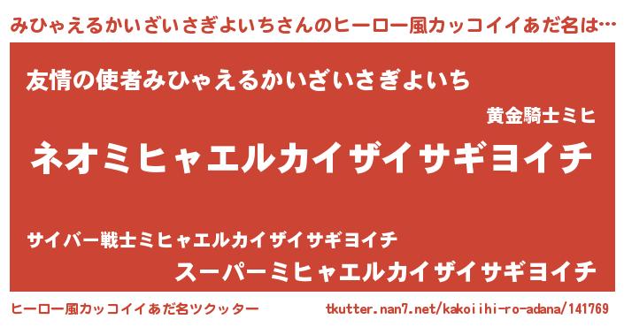 | 意味不明あだ名 | 『永久保存みひゃえるかいざいさぎよいち』 |