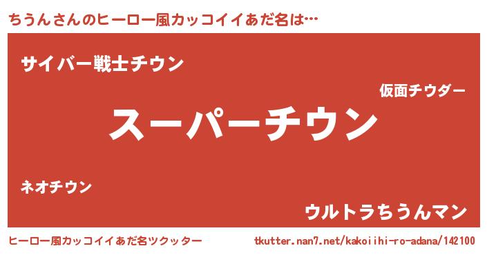 | 男性向けラノベタイトル風あだ名 | 『チウンスレイヤー』『魔弾の王とちうん』 |