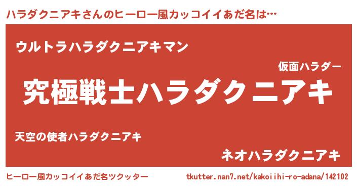 | 男性向けラノベタイトル風あだ名 | 『Re:ハラダクニアキから始める異世界生活』 |