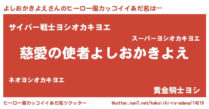 | 男性向けラノベタイトル風あだ名 | 『ノーゲーム・ノーヨシオカキヨエ』 |