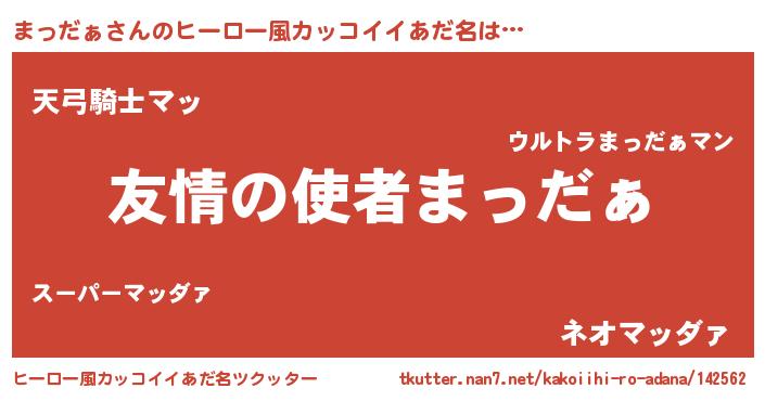 | 男性向けラノベタイトル風あだ名 | 『おまえをオタクにしてやるから、俺をまっだぁにしてくれ! 』 |