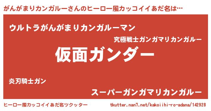 | 男性向けラノベタイトル風あだ名 | 『魔弾の王とがんがまりカンガルー』 |