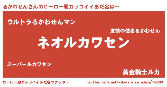 | 男性向けラノベタイトル風あだ名 | 『るかわせんという概念が存在しない退屈な世界 』 |