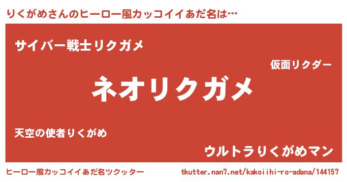 | 男性向けラノベタイトル風あだ名 | 『りくがめという概念が存在しない退屈な世界 』 |