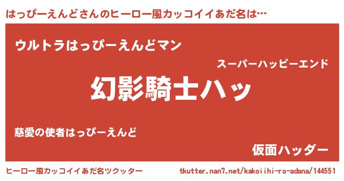 | 男性向けラノベタイトル風あだ名 | 『はっぴーえんどの嫁は女の子じゃないと思った?』 |