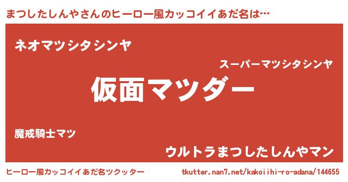 | 男性向けラノベタイトル風あだ名 | 『魔弾の王とまつしたしんや』 |