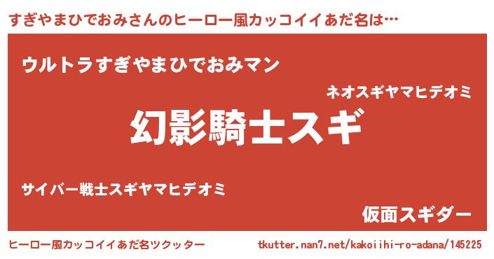 | 男性向けラノベタイトル風あだ名 | 『うちのすぎやまひでおみが世界を掌握している!』 |
