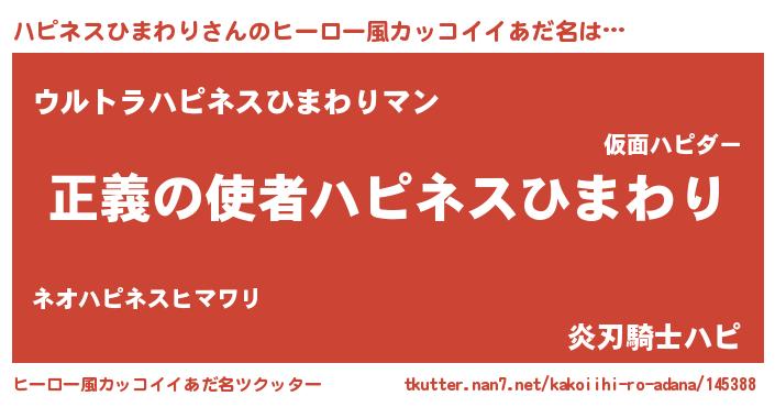 | 男性向けラノベタイトル風あだ名 | 『おまえをオタクにしてやるから、俺をハピネスひまわりにしてくれ! 』 |
