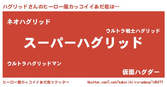 | 女子向けラノベタイトル風あだ名 | 『ハグリッド姫と円卓の騎士』 |