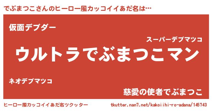 | 男性向けラノベタイトル風あだ名 | 『うちの娘の為ならば、俺はもしかしたらでぶまつこも倒せるかもしれない。』 |