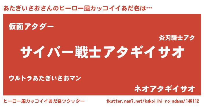 | 男性向けラノベタイトル風あだ名 | 『Re:あたぎいさおから始める異世界生活』 |