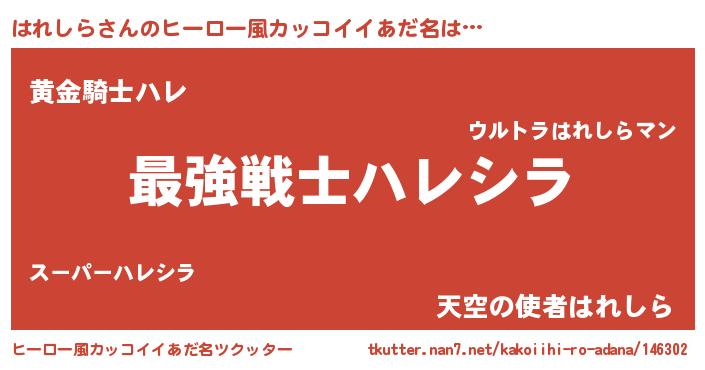 | 男性向けラノベタイトル風あだ名 | 『Re:はれしらから始める異世界生活』 |