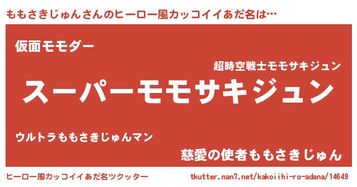 | 男性向けラノベタイトル風あだ名 | 『ももさきじゅん~年齢イコール彼女いない歴の魔法使い~』 |