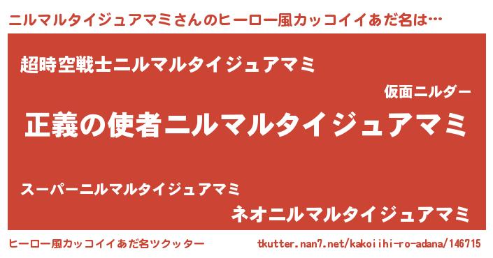 | ヘコむあだ名 | 『ニルマルタイジュアマミ(笑)』『ニルもー』 |