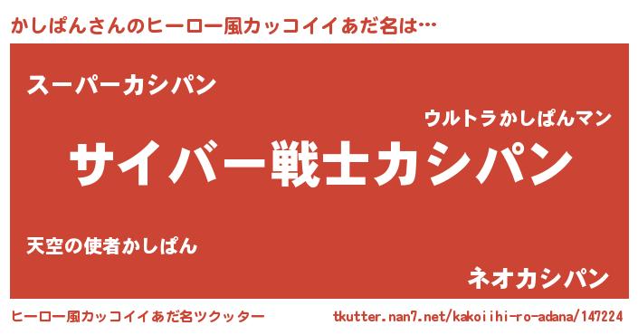 | 男性向けラノベタイトル風あだ名 | 『Re:かしぱんから始める異世界生活』 |
