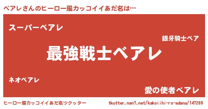 | 男性向けラノベタイトル風あだ名 | 『Re:べアレから始める異世界生活』 |