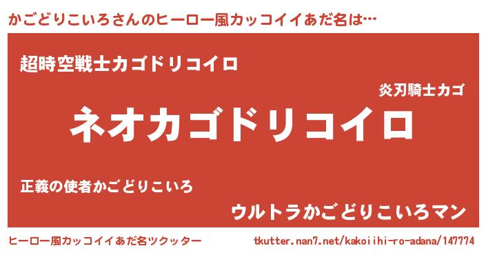 | 男性向けラノベタイトル風あだ名 | 『かごどりこいろ~年齢イコール彼女いない歴の魔法使い~』 |
