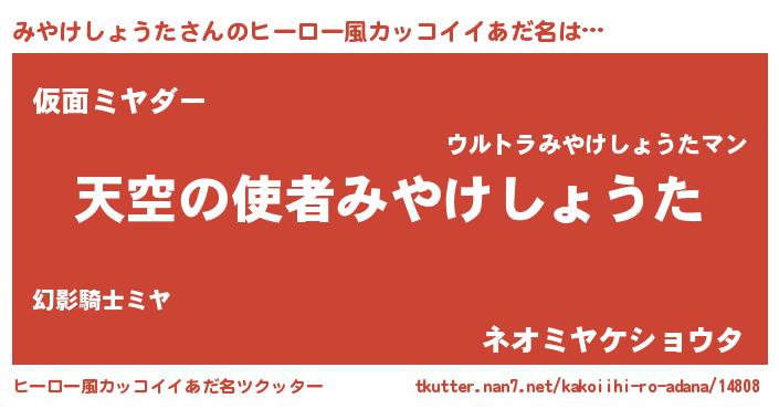 | 男性向けラノベタイトル風あだ名 | 『みやけしょうた~年齢イコール彼女いない歴の魔法使い~』 |