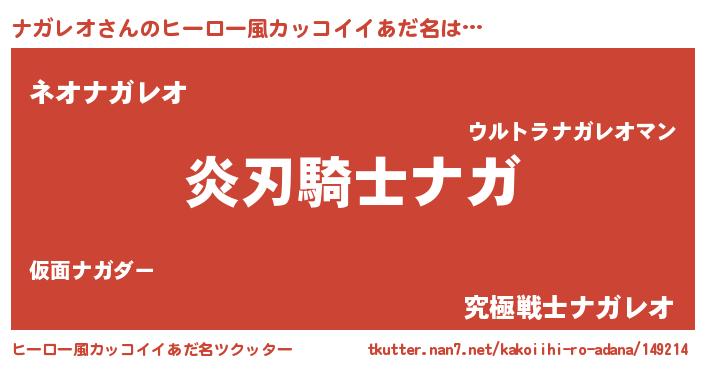 | 男性向けラノベタイトル風あだ名 | 『ナガレオの嫁は女の子じゃないと思った?』 |