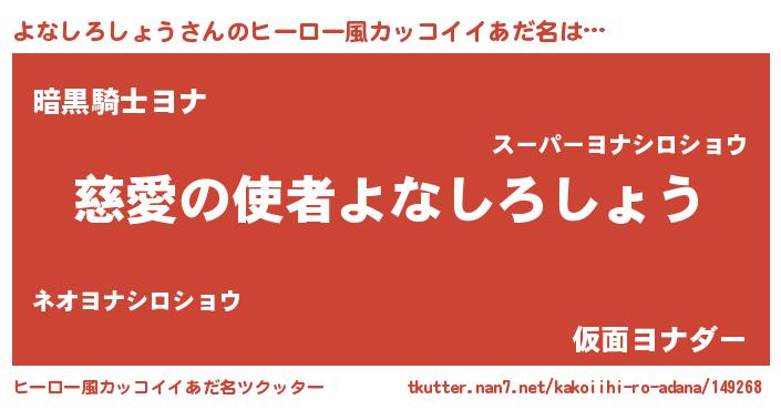 | 男性向けラノベタイトル風あだ名 | 『よなしろしょうに滅ぼされるだけの簡単なお仕事です』 |