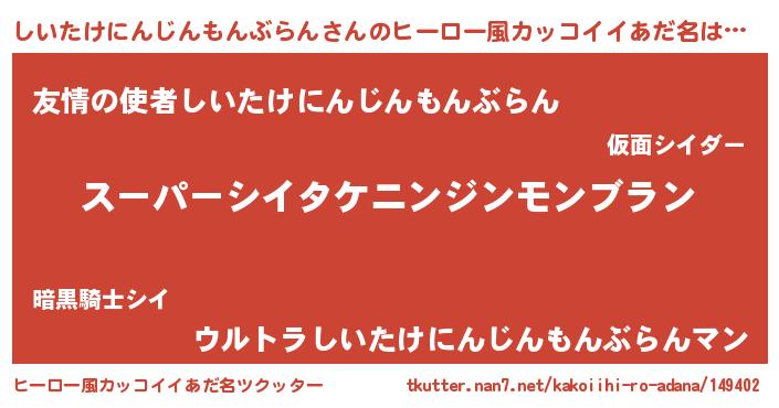 | 男性向けラノベタイトル風あだ名 | 『シイタケニンジンモンブランアートオンライン』 |