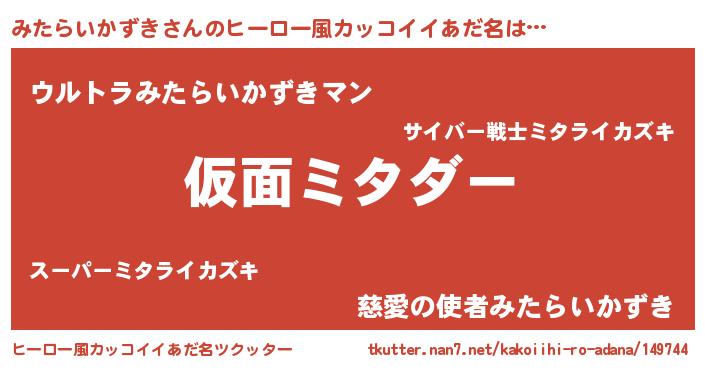 | 男性向けラノベタイトル風あだ名 | 『みたらいかずき~年齢イコール彼女いない歴の魔法使い~』 |