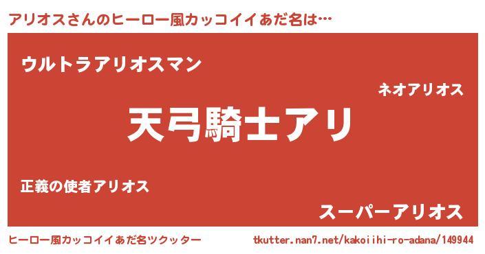 | 男性向けラノベタイトル風あだ名 | 『アリオス~年齢イコール彼女いない歴の魔法使い~』 |