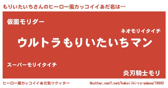 | 男性向けラノベタイトル風あだ名 | 『もりいたいち~年齢イコール彼女いない歴の魔法使い~』 |