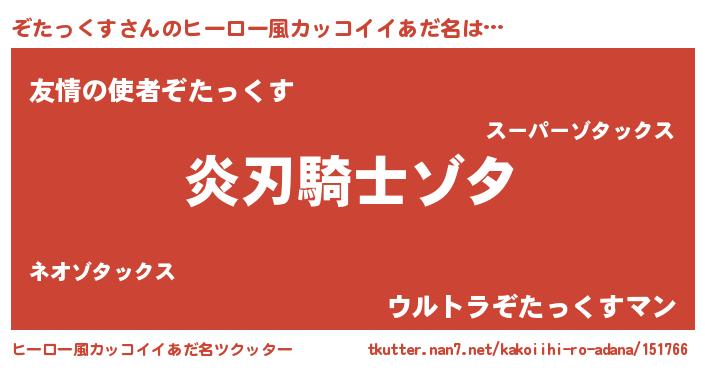 | 男性向けラノベタイトル風あだ名 | 『ぞたっくすの嫁は女の子じゃないと思った?』 |