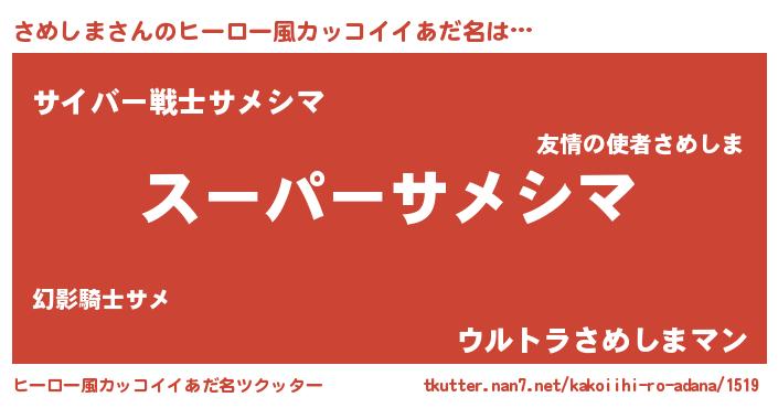| 男性向けラノベタイトル風あだ名 | 『さめしま~年齢イコール彼女いない歴の魔法使い~』 |