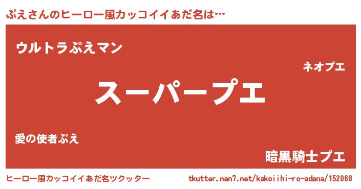 | 女子向けラノベタイトル風あだ名 | 『(仮)ぷえのやんごとなき事情』 |