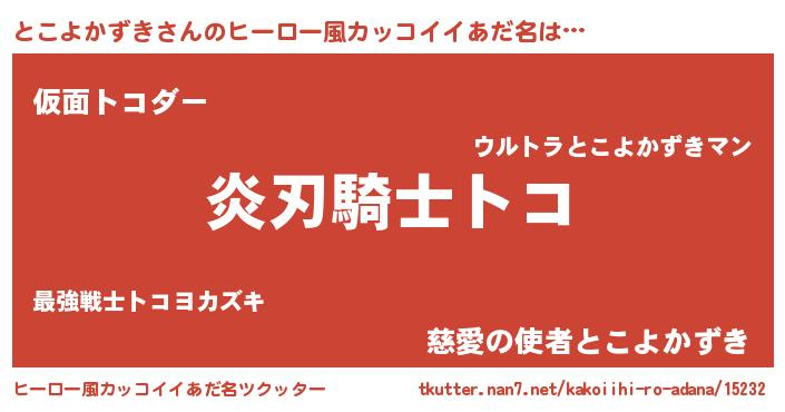 | 男性向けラノベタイトル風あだ名 | 『とこよかずきの嫁は女の子じゃないと思った?』 |