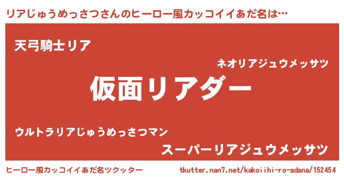 | 男性向けラノベタイトル風あだ名 | 『転生したらリアじゅうめっさつだった件』 |