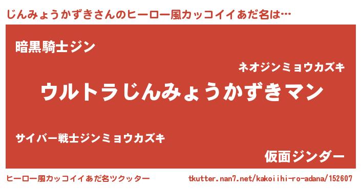 | 男性向けラノベタイトル風あだ名 | 『ジンミョウカズキスレイヤー』 |