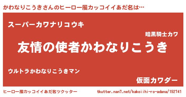 | 男性向けラノベタイトル風あだ名 | 『おまえをオタクにしてやるから、俺をかわなりこうきにしてくれ! 』 |