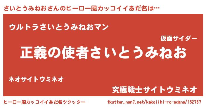 | 男性向けラノベタイトル風あだ名 | 『おまえをオタクにしてやるから、俺をさいとうみねおにしてくれ! 』 |