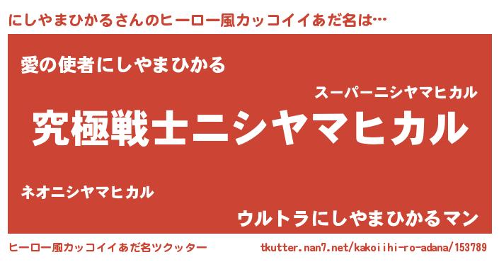 | 男性向けラノベタイトル風あだ名 | 『にしやまひかる~年齢イコール彼女いない歴の魔法使い~』 |