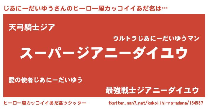 | 男性向けラノベタイトル風あだ名 | 『じあにーだいゆうの憂鬱』 |