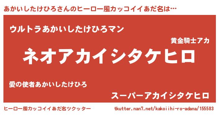 | 男性向けラノベタイトル風あだ名 | 『あかいしたけひろ~年齢イコール彼女いない歴の魔法使い~』 |