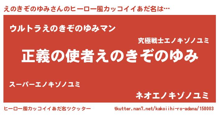 | 男性向けラノベタイトル風あだ名 | 『おまえをオタクにしてやるから、俺をえのきぞのゆみにしてくれ! 』 |