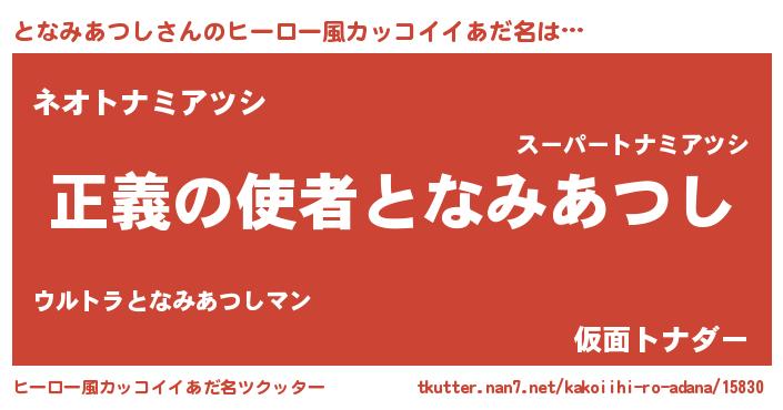 | 男性向けラノベタイトル風あだ名 | 『トナミアツシスレイヤー』 |