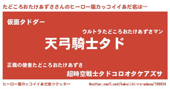 | 男性向けラノベタイトル風あだ名 | 『たどころおたけあずさの嫁は女の子じゃないと思った?』 |