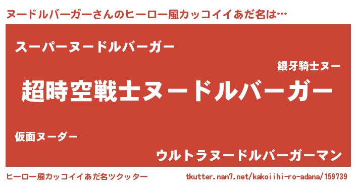 | 女子向けラノベタイトル風あだ名 | 『ヌードルバーガーなんてお断りですっ。』 |