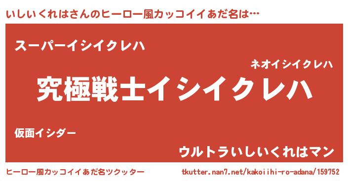 | 男性向けラノベタイトル風あだ名 | 『いしいくれは~年齢イコール彼女いない歴の魔法使い~』 |