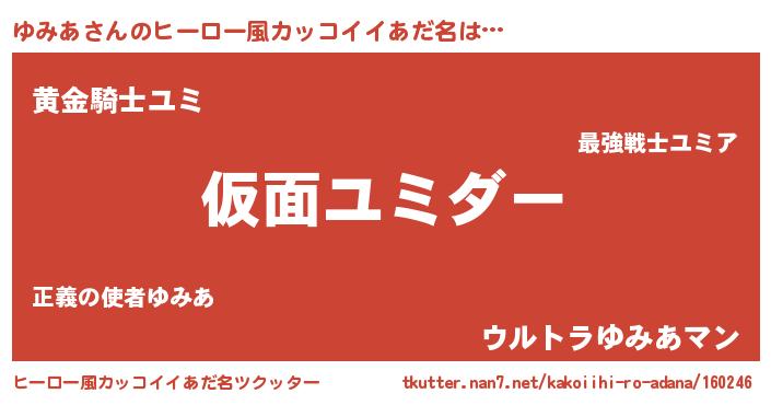 | 男性向けラノベタイトル風あだ名 | 『ゆみあ~年齢イコール彼女いない歴の魔法使い~』 |