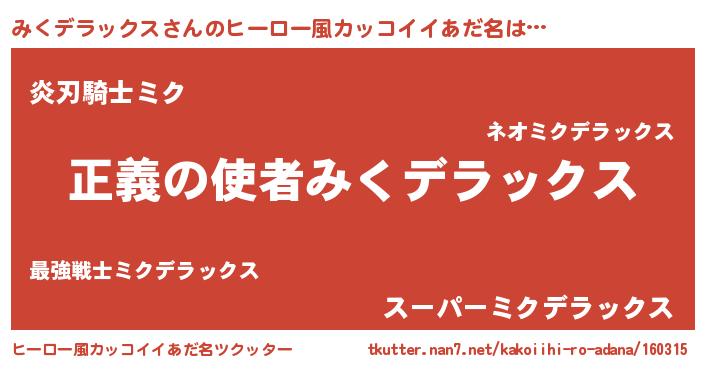 | 男性向けラノベタイトル風あだ名 | 『おまえをオタクにしてやるから、俺をみくデラックスにしてくれ! 』 |