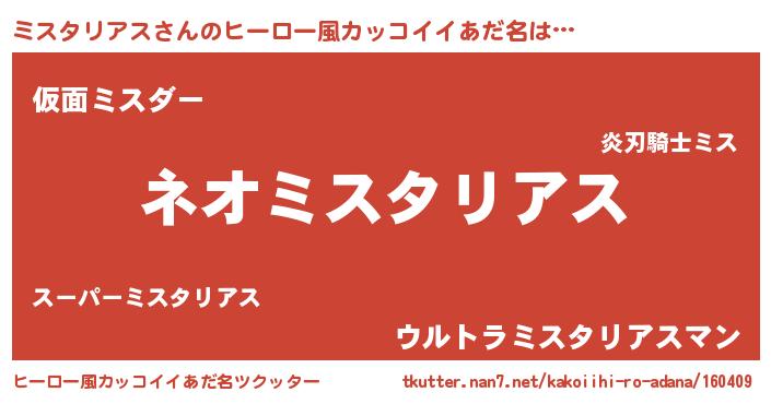 | 男性向けラノベタイトル風あだ名 | 『ミスタリアスに滅ぼされるだけの簡単なお仕事です』 |